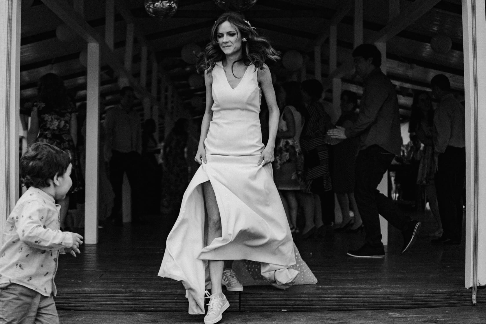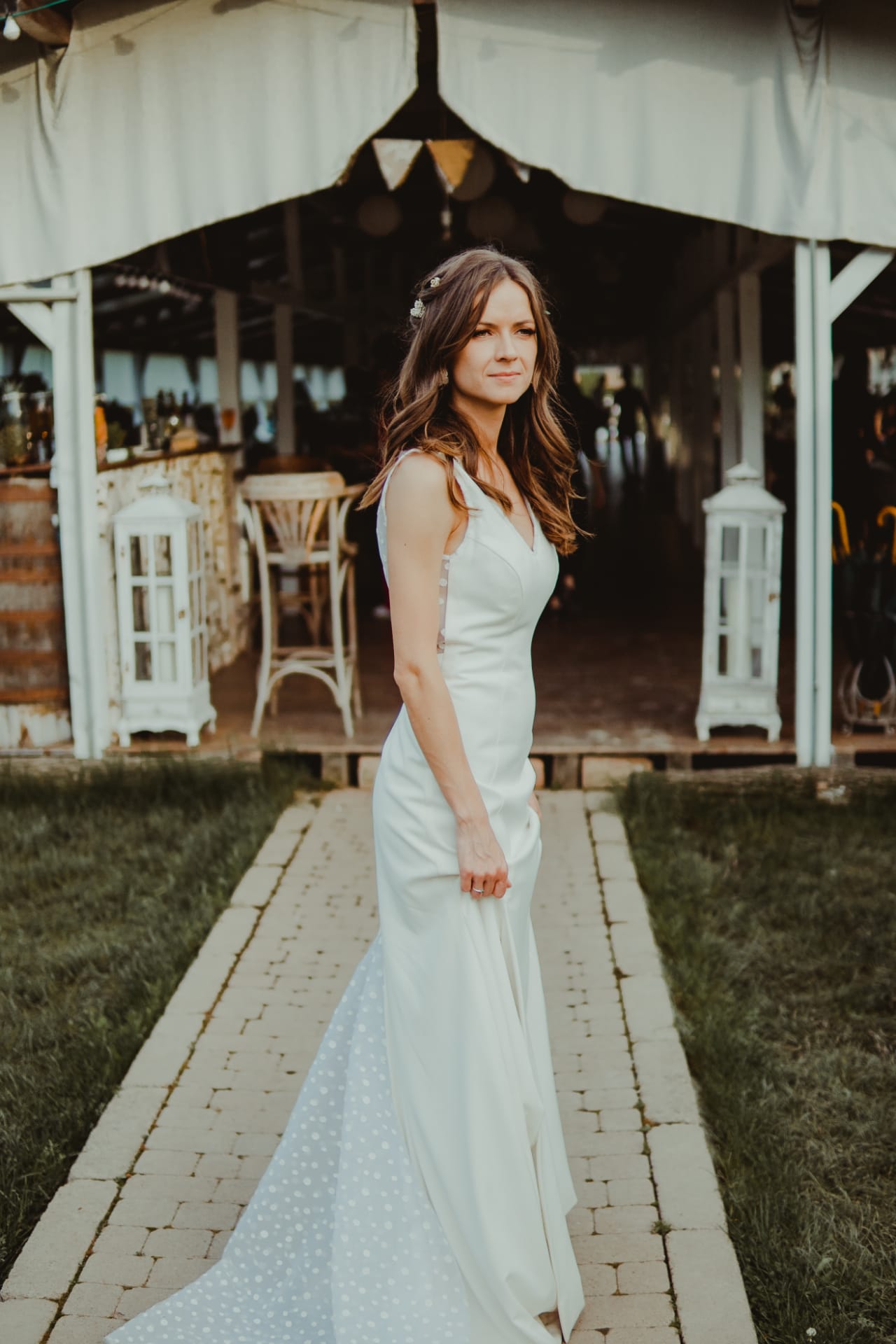 Era vontade da Alexandra fazer um jogo de “mostra-esconde”, o que nos levou a desenhar um vestido com um decote em V profundo nas costas onde realçámos, não só alguma pele, como também o tule de bolinhas e cuja linha continuámos até à cauda, com um macho generoso onde colocámos o mesmo tule, num jogo de transparências que, com a racha trespassada na frente do vestido lhe adicionou, a meu ver, um q.b. de sexiness.